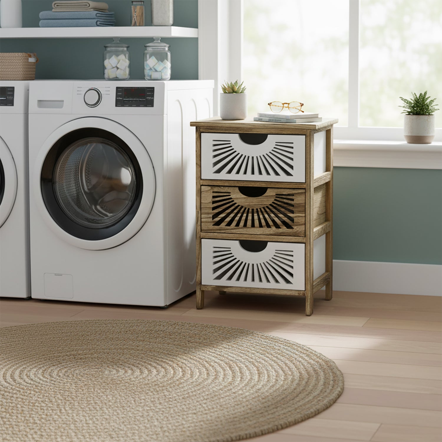Vestiamo Casa Mobiletto multiuso 3 cassetti Legno Naturale e Bianco decorati Home...